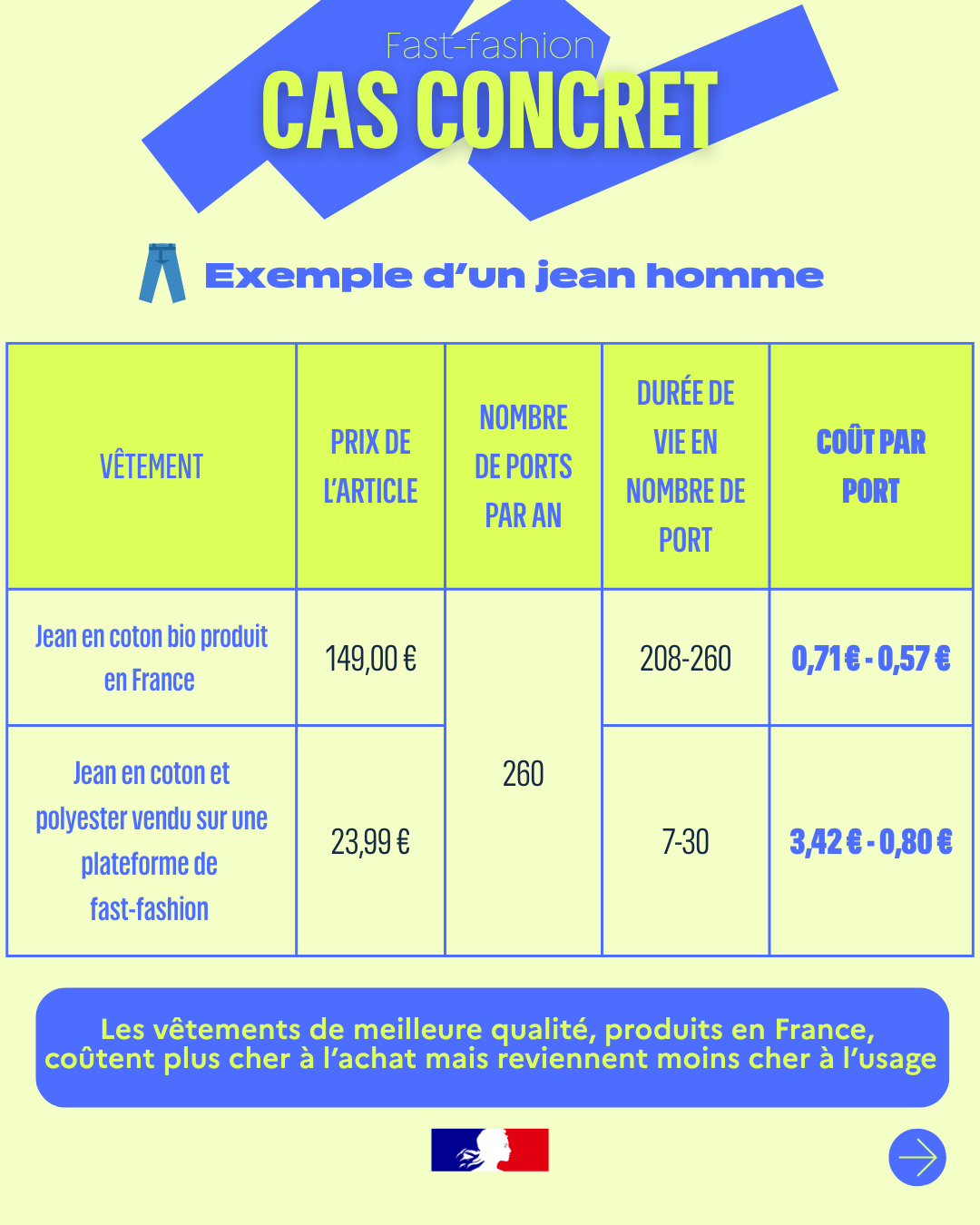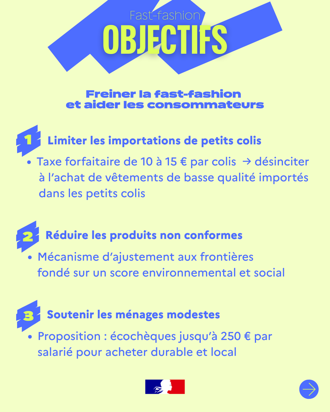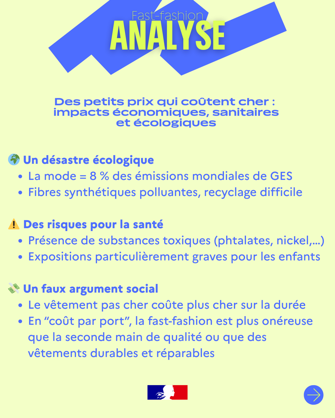 Infographie/datavisualisation Et s’il était moins cher d’acheter durable ? Macroéconomie Compétitivité Pouvoir d’achat Dans un nouveau Point de vue, le Haut-commissariat à la Stratégie et au Plan mesure l’impact du recours à la fast fashion sur notre société. Déclin de la filière de l’habillement, dévitalisation des centres villes, cette surconsommation a des conséquences directes en matière économique, sanitaire et écologique. Face à ce constat, cette étude donne la vérité des prix en considérant le cycle de vie complet d’un article plutôt que le simple prix d’achat, et en regardant ainsi le coût par port des produits. Et des idées pour avancer, notamment : ✅ Instaurer une redevance de 10 à 15 euros sur tout petit colis entrant dans l’UE, pour arrêter la déferlante ✅ Créer un écochèque destiné aux achats de produits durables et fabriqués en France ou dans l’UE ✅ Appliquer une TVA réduite de 5,5% sur les actes de réparation ✅ Soutenir la filière textile en la rendant éligible au crédit d’impôt industrie verte Publié le : 09/01/2026 Mis à jour le : 19/01/2026 Consulter le Point de vue Pour aller plus loin La fast-fashion : une solution pour votre pouvoir d’achat ? Clément Beaune, Haut-commissaire à la Stratégie et au Plan compare un jean fabriqué en France et un jean d’une marque de fast-fashion. Macroéconomie Compétitivité Pouvoir d’achat Vidéo 09 janvier 2026 Fast-fashion : un remède en trompe-l’œil au problème de pouvoir d’achat La consommation de vêtements de fast-fashion est un trompe-l’œil : si ce modèle apparaît à court terme comme une réponse aux contr... Macroéconomie Compétitivité Pouvoir d’achat Haut-commissariat à la Stratégie et au Plan 09 janvier 2026