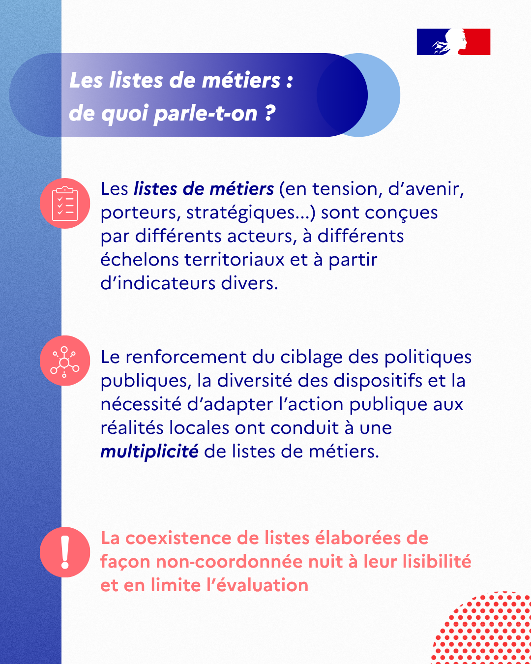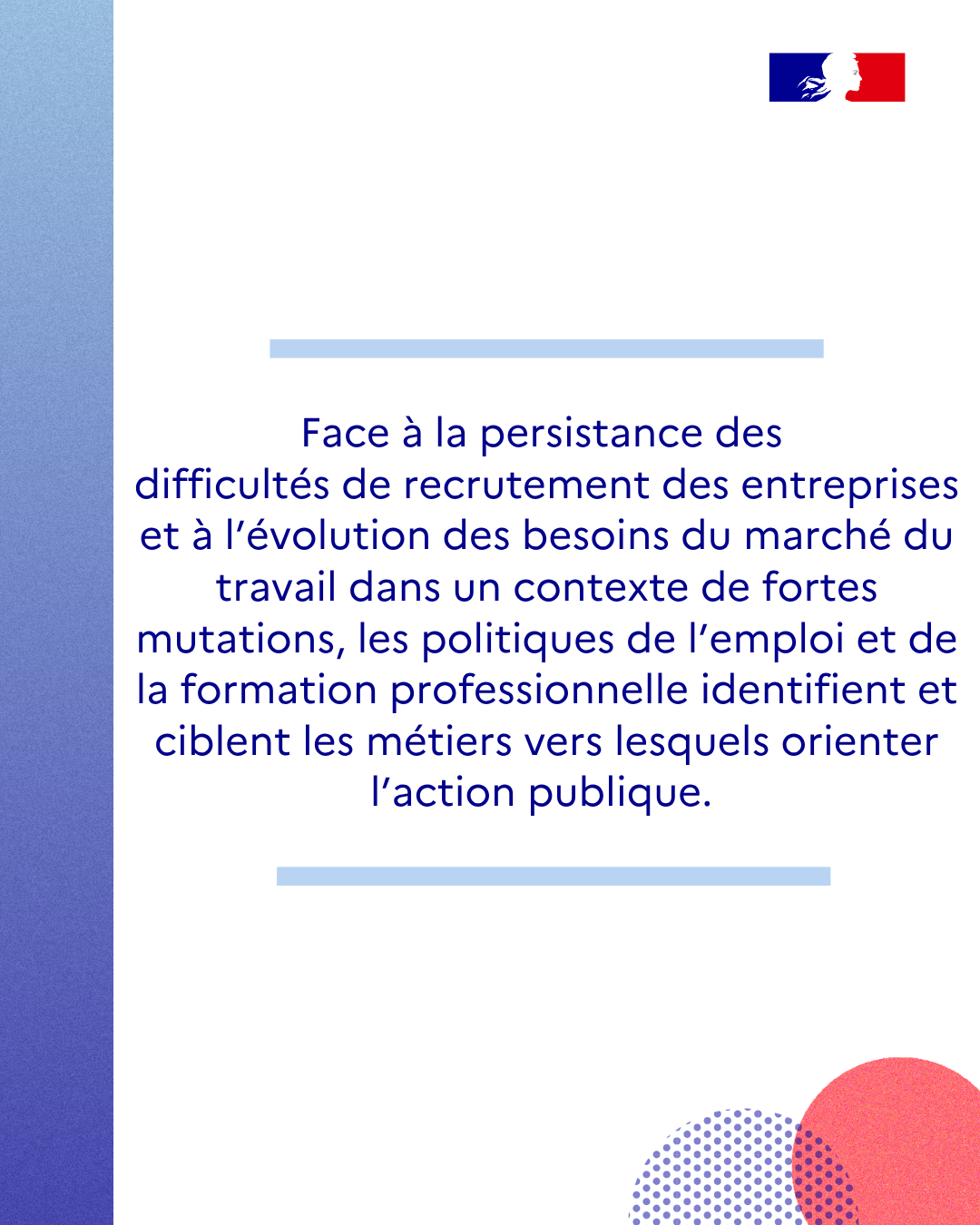 Infographie/datavisualisation Les listes de métiers : un enjeu d’efficacité et de lisibilité des politiques d’emploi et de formation Emploi/chômage Compétences/métiers Travail Face à la persistance des difficultés de recrutement des entreprises et à l’évolution des besoins du marché du travail, les politiques de l’emploi et de la formation professionnelle identifient et ciblent les métiers vers lesquels orienter l’action publique. Les listes de métiers constituent une déclinaison concrète des orientations stratégiques de la politique de l’emploi et de la formation. Dans le prolongement de ses travaux réalisés en 2022 pour cartographier ces listes, le Réseau Emplois Compétences (REC) animé par le Haut-commissariat à la Stratégie et au Plan publie un nouveau document de travail éclairant l’articulation entre usages des listes de métiers et objectifs de politique publique. Publié le : 05/09/2025 Mis à jour le : 16/10/2025 Pour aller plus loin REC | Les listes de métiers : un enjeu d’efficacité et de lisibilité des politiques d’emploi et de formation Les listes de métiers constituent une déclinaison concrète des orientations stratégiques de la politique de l’emploi et de la form... Emploi/chômage Compétences/métiers Travail Réseau Emplois Compétences 04 septembre 2025 REC | Mettre en œuvre la planification écologique des emplois et des compétences à l’échelle des territoires La planification écologique est un défi pour l’emploi : former d’ici 2030 près de 3 millions d’actifs dans les secteurs clés de la... Emploi/chômage Compétences/métiers Prospective Réseau Emplois Compétences 11 septembre 2025 Webconference REC | Comment prendre en compte la transition écologique dans les certifications professionnelles ? Le Réseau Emplois Compétences (REC), en collaboration avec l’Observatoire national des emplois et métiers de l’économie verte (Onemev), organise une réunion thématique dédiée à l’intégration de la transition écologique d... Changement climatique Compétences/métiers Rediffusion 09 juillet 2025