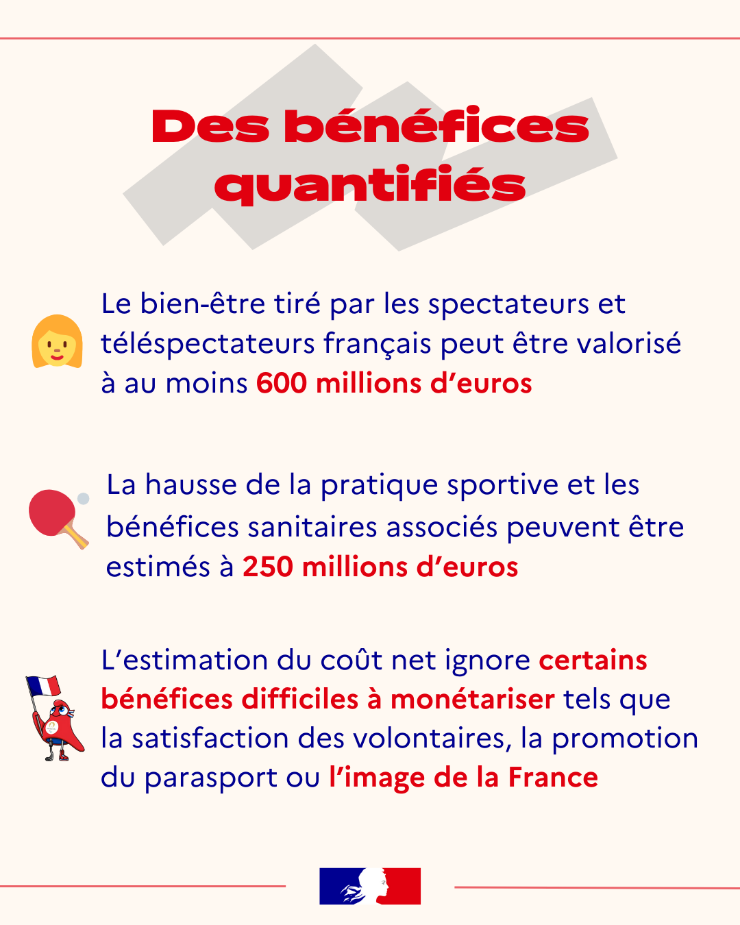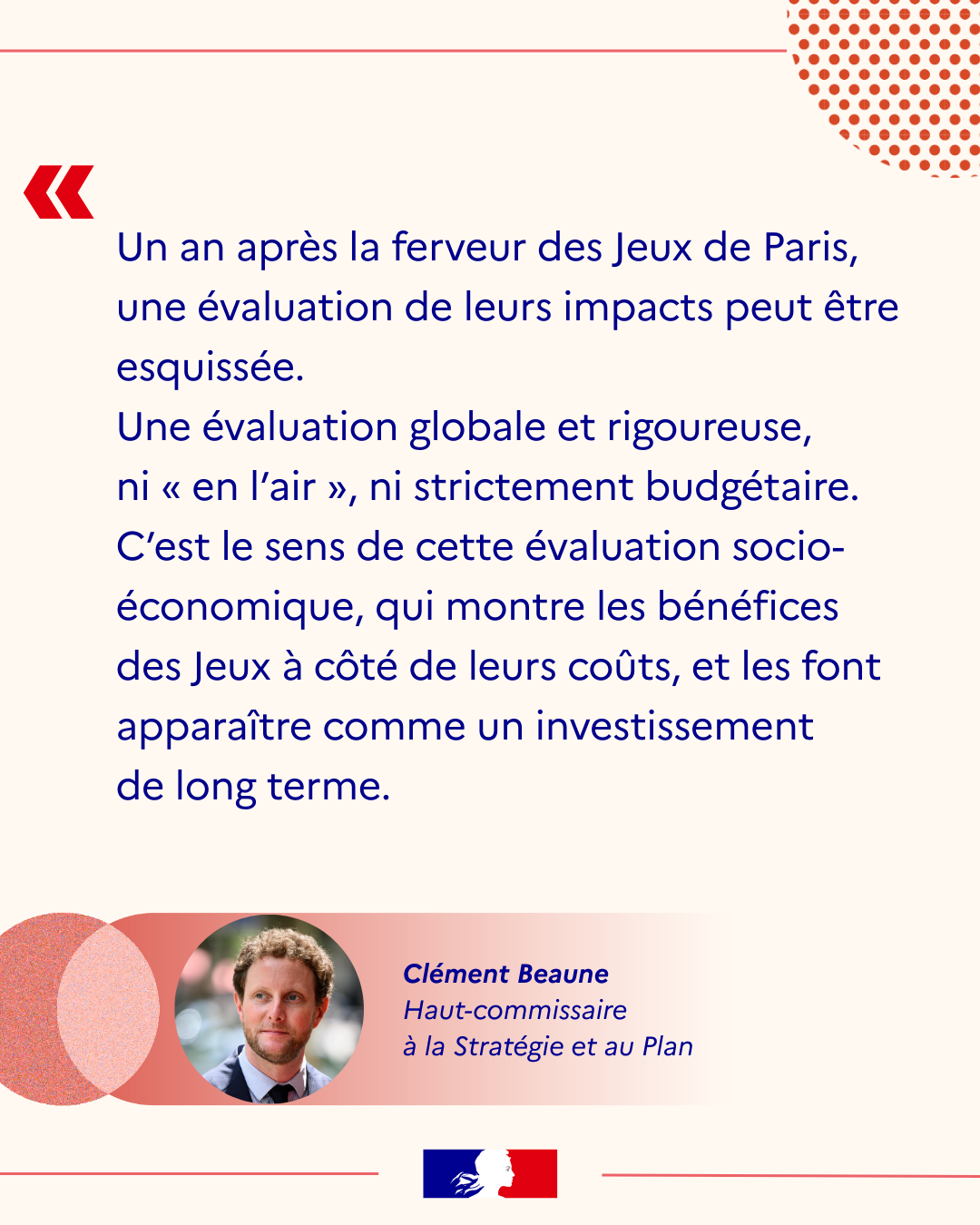Infographie/datavisualisation Paris 2024 : au-delĂ des coĂ»ts budgĂ©taires, quels bĂ©nĂ©fices pour aujourdâhui et demain ? MacroĂ©conomie Finances publiques Emploi/chĂŽmage Ăvaluation đ Dans une nouvelle note de synthĂšse, le Haut-commissariat Ă la StratĂ©gie et au Plan dĂ©voile les rĂ©sultats dâune analyse coĂ»ts-bĂ©nĂ©fices inĂ©dite, rĂ©alisĂ©e par le CREDOC et suivie par un conseil scientifique. Au-delĂ du coĂ»t budgĂ©taire, lâĂ©tude Ă©value les nombreux bĂ©nĂ©fices des Jeux, notamment en matiĂšre de tourisme đïž. Elle y intĂšgre Ă©galement les premiers effets de lâhĂ©ritage des JOP en matiĂšre dâinfrastructures đïž et de pratique sportive đ. Le coĂ»t climatique de lâĂ©vĂ©nement y est enfin analysĂ©. đ° Un coĂ»t socioĂ©conomique net estimĂ© Ă 3 milliards dâeuros au maximum Bien que les dĂ©penses publiques atteignent 6,6âŻmilliards, ce montant est plus que divisĂ© par deux une fois pris en compte les bĂ©nĂ©fices, lâimpact climatique et la valeur de lâhĂ©ritage laissĂ© par lâĂ©vĂ©nement. đ Des effets constatĂ©s sur le tourisme Si lâhĂŽtellerie enregistre un lĂ©ger recul en 2024, les propriĂ©taires franciliens auraient quant Ă eux tirĂ© profit des Jeux. đ± Les JOP plus sobres en carbone que les prĂ©cĂ©dents Les Jeux ont gĂ©nĂ©rĂ© 2,1âŻmillions de tonnes de CO2, dont 800âŻ000âŻen France. Ils restent plus sobres en carbone que les Ă©ditions prĂ©cĂ©dentes. đ Des impacts quantifiĂ©s LâĂ©vĂ©nement a renforcĂ© le bien-ĂȘtre des spectateurs français et encouragĂ© la pratique sportive, avec des effets positifs sur la santĂ©. PubliĂ© le : 16/12/2025 Mis Ă jour le : 09/02/2026 Consulter le rapport Pour aller plus loin Une nouvelle stratĂ©gie pour le spatial français et europĂ©en : viser haut mais viser juste « Le Plan est depuis toujours un carrefour. Il publie ses propres travaux dâĂ©clairage et doit aussi relayer des idĂ©es extĂ©rieures,... Finances publiques Prospective StratĂ©gie Haut-commissariat Ă la StratĂ©gie et au Plan 06 fĂ©vrier 2026 HCFiPS | Les fondamentaux du HCFiPS - AmĂ©liorer la qualitĂ© de l'emploi est essentiel pour garantir les Ă©quilibres financiers de la sĂ©curitĂ© sociale La nĂ©cessitĂ© de dĂ©velopper des emplois de qualitĂ© est rĂ©guliĂšrement rappelĂ©e dans les rapports du HCFiPS. Le prĂ©sent document rass... Finances publiques Protection sociale Haut Conseil du financement de la protection sociale 09 janvier 2026 HCFiPS | Les fondamentaux du HCFiPS - PluriannualitĂ© et temps long : une approche indispensable au pilotage de la sĂ©curitĂ© sociale La nĂ©cessitĂ© dâune approche des politiques publiques « sur le temps long » revient rĂ©guliĂšrement dans le dĂ©bat public. Le HCFiPS p... Finances publiques Protection sociale Haut Conseil du financement de la protection sociale 09 janvier 2026